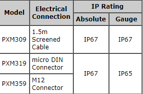 PXM309系列傳感器具有**或表壓(相對)壓力,并根據(jù)型號密封至IP65或IP67環(huán)境等級(見下表)。