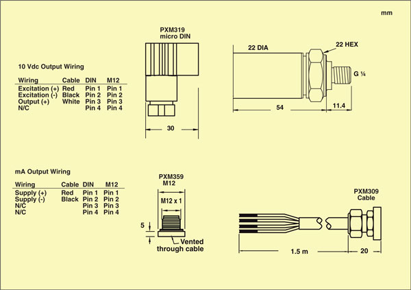 PXM309-010G10V 電纜型號,10巴量程,表壓,0至10 V直流輸出